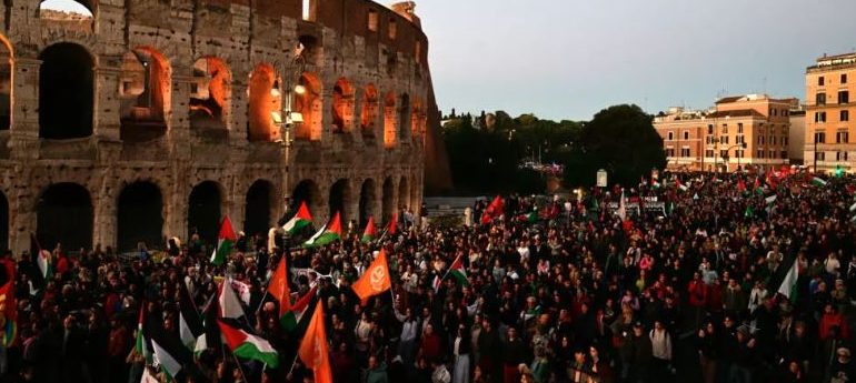 ইতালিতে দেশের প্রধান ইউনিয়নগুলো ফ্লোটিলার সাথে সংহতি জানিয়ে শুক্রবার সাধারণ ধর্মঘটের ডাক দিয়েছে। সেখানে হাজার হাজার মানুষ রাস্তায় নেমে প্রধানমন্ত্রী জর্জিয়া মেলোনিকে কর্মীদের রক্ষা করার আহ্বান জানিয়েছে।