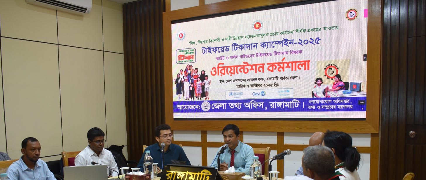 টাইফয়েড টিকাদান ক্যাম্পেইন সফলভাবে বাস্তবায়নের লক্ষ্যে রাঙ্গামাটি জেলা তথ্য অফিসের আয়োজনে “শিশু, কিশোর-কিশোরী ও নারী উন্নয়নে সচেতনতামূলক প্রচার কার্যক্রম” প্রকল্পের আওতায় টাইফয়েড ভ্যাক্সিনেশন বিষয়ে স্কাউট ও গার্লস গাইডদের ওরিয়েন্টেশন কর্মশালা অনুষ্ঠিত হয়েছে।