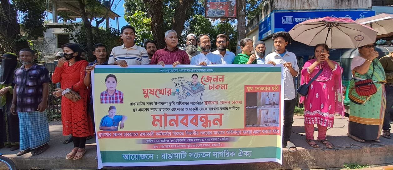 রাঙ্গামাটি সদর উপজেলা ভূমি অফিসের সার্ভেয়ার জেনন চাকমাকে ঘুষ গ্রহণের অভিযোগে গ্রেফতার ও চাকুরী থেকে বরখাস্ত করার দাবিতে মানববন্ধন করেছে রাঙ্গামাটি সচেতন নাগরিক ঐক্য।