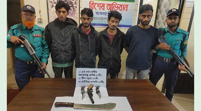 রবিবার (৩০ নভেম্বর) ভোরে আকবরশাহ থানার অফিসার ইনচার্জ মোঃ আরিফুর রহমান এর নির্দেশনা মোতাবেক শাপলা আবাসিক এলাকায় অভিযান পরিচালনা করে ১ টি দেশীয় তৈরি এলজি, ১টি চায়নিজ চা-পাতি, ২টি স্টিলের টিপ ছোরাসহ ৪জনকে গ্রেপ্তার করে পুলিশ