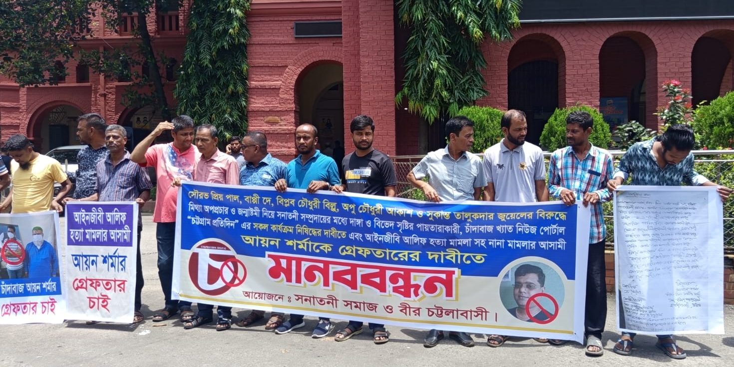 আইনজীবী সাইফুল ইসলাম আলিফ হত্যা মামলার আসামী বিতর্কিত সাংবাদিক আয়ান শর্মাকে গ্রেপ্তার ও তার মালিকানাধীন ‘চট্টগ্রাম প্রতিদিন’ ও ‘আলোকিত চট্টগ্রাম’ নামক অনলাইন পত্রিকা দুটি বন্ধের দাবিতে চট্টগ্রামে মানববন্ধন করেছে সনাতনী সমাজ।