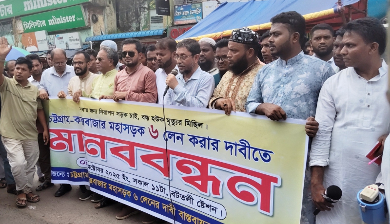 চট্টগ্রাম-কক্সবাজার মহাসড়ক ৬ লেনের দাবীতে লোহাগাড়ায় মানববন্ধন