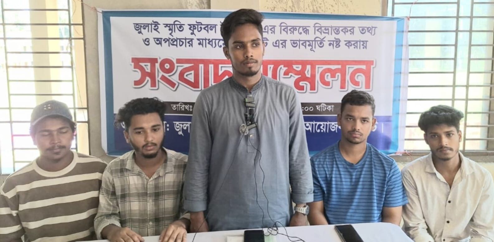 সংবাদ সম্মেলনে উপস্থিত ছিলেন- জুলাই স্মৃতি ফুটবল টুর্ণামেন্ট পরিচালনা কমিটির আহ্বায়ক মোঃ মুজিবুর রহমান,যুগ্ম-সদস্য সচিব মোঃ আদনান,প্রধান সমন্বয়কারী মোঃ এনামুল হক সাকিব,সদস্য মোঃ শিহাব, মোঃ মাসুদ প্রমূখ।