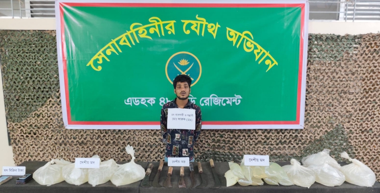 অভিযানে এ সময় তার কাছ থেকে ৭টি দেশীয় অস্ত্র, ১০০ লিটার দেশীয় চোলাই মদ, ৪টি মোবাইল ফোন এবং নগদ ৯৪ হাজার ১০০ টাকা উদ্ধার করা হয়।