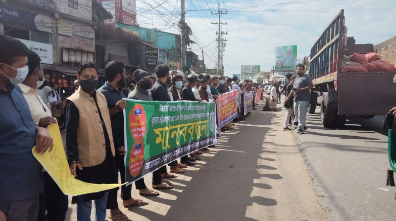 সাইফুল আরমান চৌধুরীর সঞ্চালনায় মানববন্ধনে এসময় বক্তব্য রাখেন নাঈমুল ইসলাম, আরিফ, জুবাইর, মারুফ, ইমাম উদ্দিন, আবদুল জাব্বার, সরওয়ার, হুমায়ন কবির, সেলিম উদ্দিন খান ও নুরুল আলম প্রমুখ।